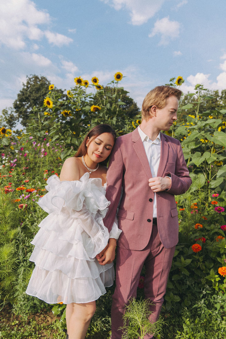 In a breathtaking flower garden, a couple's love blossoms amidst a riot of colors. Petals dance in the air as the pair, surrounded by nature's beauty, shares tender moments. The radiant garden becomes a canvas for their love story, where every frame captures the enchanting beauty of their connection amidst the vibrant sea of flowers.